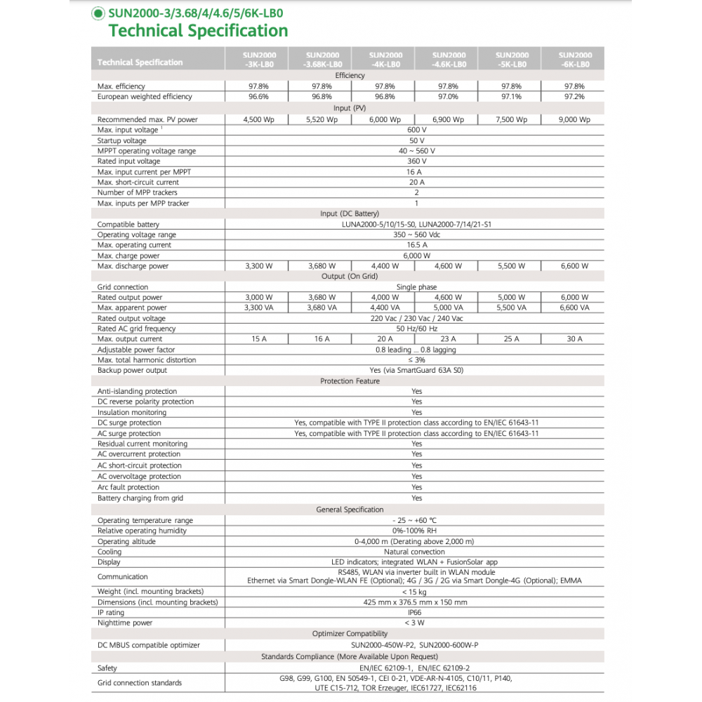 El inversor Huawei SUN2000-6KTL-LB0 de 6000W representa la nueva generación de soluciones residenciales para el autoconsumo fotovoltaico. Diseñado para maximizar la producción de energía y ofrecer una gestión inteligente, este inversor monofásico es la pieza clave para convertir tu hogar en un espacio energéticamente eficiente y sostenible.